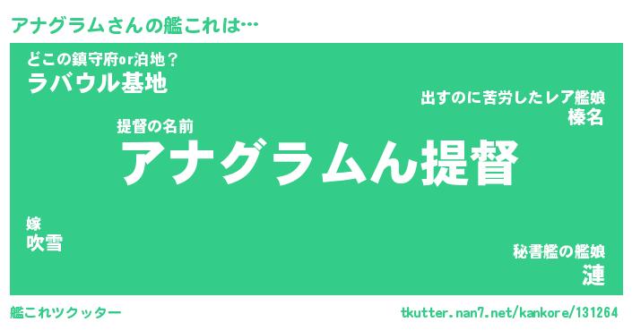 | 料理風あだ名 | 『節約★アナグラムと油揚げの玉子丼』 |