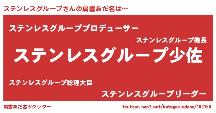 | 男性向けラノベタイトル風あだ名 | 『ステンレスグループ~年齢イコール彼女いない歴の魔法使い~』 |