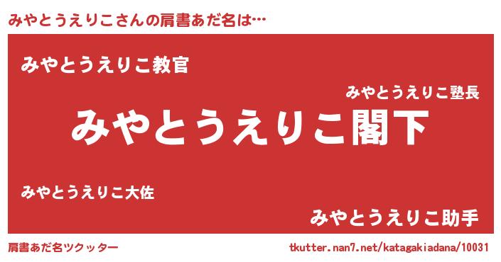 | 男性向けラノベタイトル風あだ名 | 『Re:みやとうえりこから始める異世界生活』 |