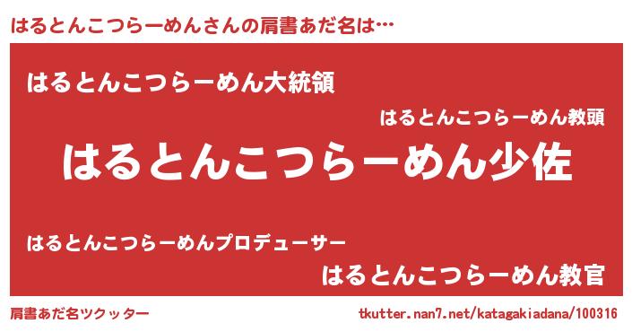 | 男性向けラノベタイトル風あだ名 | 『はるとんこつらーめん~年齢イコール彼女いない歴の魔法使い~』 |