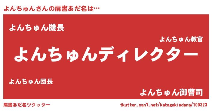 | 男性向けラノベタイトル風あだ名 | 『よんちゅんに滅ぼされるだけの簡単なお仕事です』 |