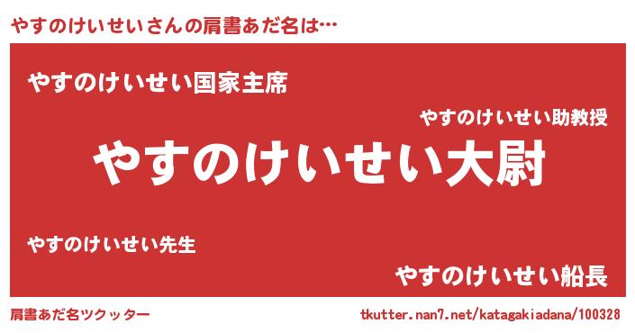 | 男性向けラノベタイトル風あだ名 | 『転生したらやすのけいせいだった件』 |