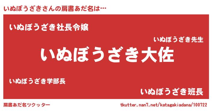 | 男性向けラノベタイトル風あだ名 | 『いぬぼうざき~年齢イコール彼女いない歴の魔法使い~』 |