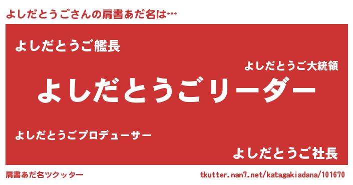 | 男性向けラノベタイトル風あだ名 | 『よしだとうごの嫁は女の子じゃないと思った?』 |