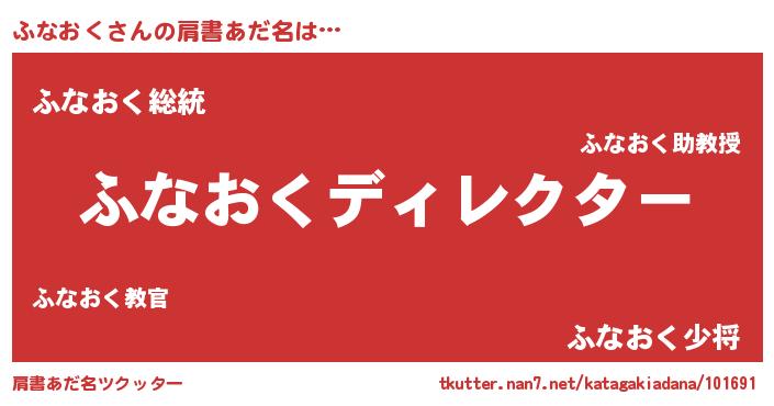 | 男性向けラノベタイトル風あだ名 | 『ふなおくに滅ぼされるだけの簡単なお仕事です』 |