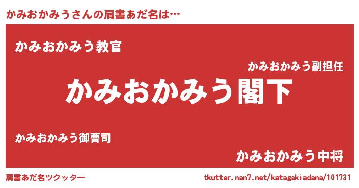 | 男性向けラノベタイトル風あだ名 | 『Re:かみおかみうから始める異世界生活』 |