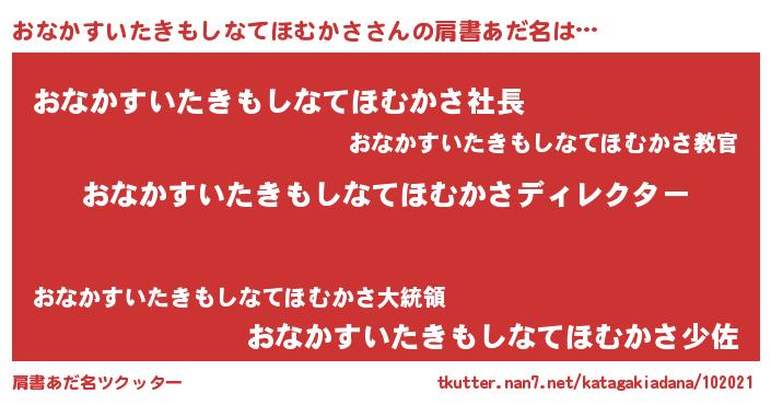 | ヒーロー風カッコイイあだ名 | 『スーパーオナカスイタキモシナテホムカサ』 |