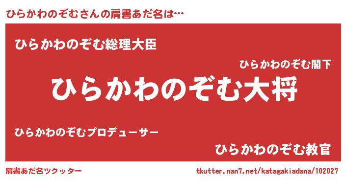 | 男性向けラノベタイトル風あだ名 | 『転生したらひらかわのぞむだった件』 |