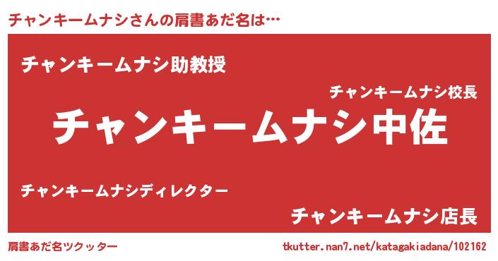 | 男性向けラノベタイトル風あだ名 | 『チャンキームナシ~年齢イコール彼女いない歴の魔法使い~』 |
