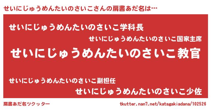 | 意味不明あだ名 | 『住所不定無職せいにじゅうめんたいのさいこ(98歳)』 |