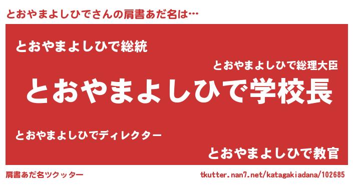 | 男性向けラノベタイトル風あだ名 | 『おまえをオタクにしてやるから、俺をとおやまよしひでにしてくれ! 』 |