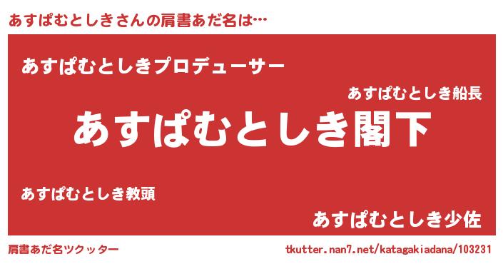 | 意味不明あだ名 | 『自称あすぱむとしき』 |