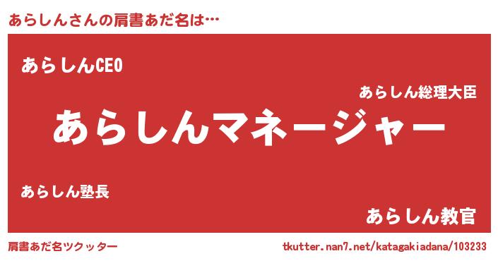 | 男性向けラノベタイトル風あだ名 | 『あらしんに滅ぼされるだけの簡単なお仕事です』 |