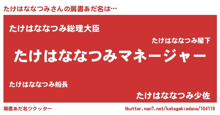 | 男性向けラノベタイトル風あだ名 | 『たけはななつみに滅ぼされるだけの簡単なお仕事です』 |