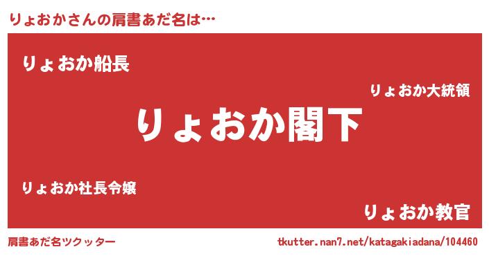 | 男性向けラノベタイトル風あだ名 | 『Re:りょおかから始める異世界生活』 |