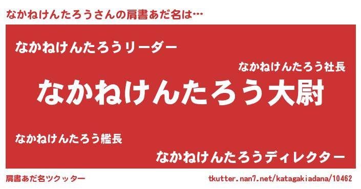 | 男性向けラノベタイトル風あだ名 | 『なかねけんたろう~年齢イコール彼女いない歴の魔法使い~』 |