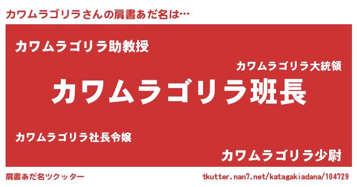 | 男性向けラノベタイトル風あだ名 | 『カワムラゴリラの嫁は女の子じゃないと思った?』 |