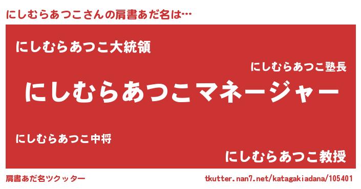 | 男性向けラノベタイトル風あだ名 | 『はたらくにしむらあつこさま!』 |