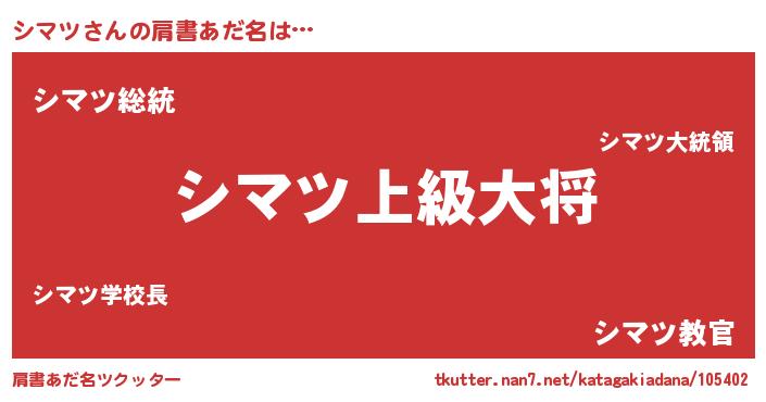 | 男性向けラノベタイトル風あだ名 | 『転生したらシマツだった件』 |