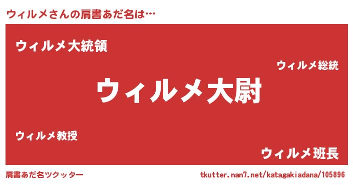 | 男性向けラノベタイトル風あだ名 | 『ウィルメ~年齢イコール彼女いない歴の魔法使い~』 |