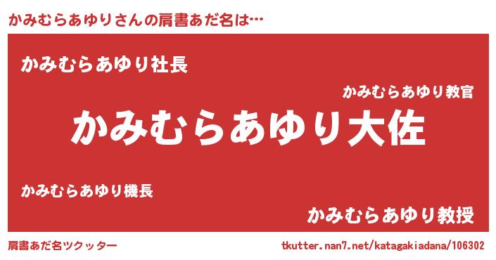 | 男性向けラノベタイトル風あだ名 | 『かみむらあゆり~年齢イコール彼女いない歴の魔法使い~』 |