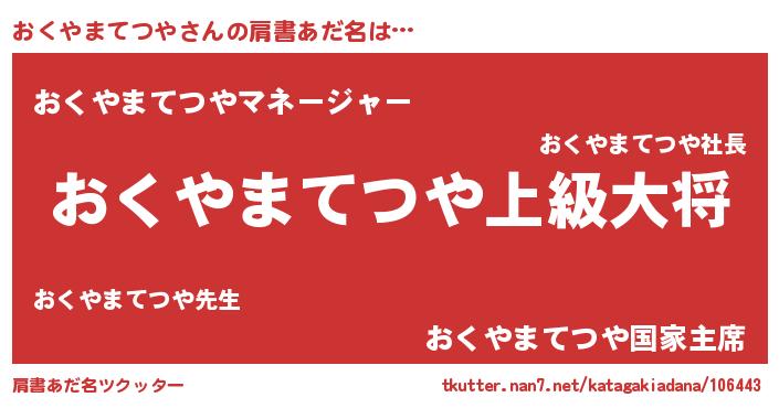 | 男性向けラノベタイトル風あだ名 | 『おくやまてつや~年齢イコール彼女いない歴の魔法使い~』 |