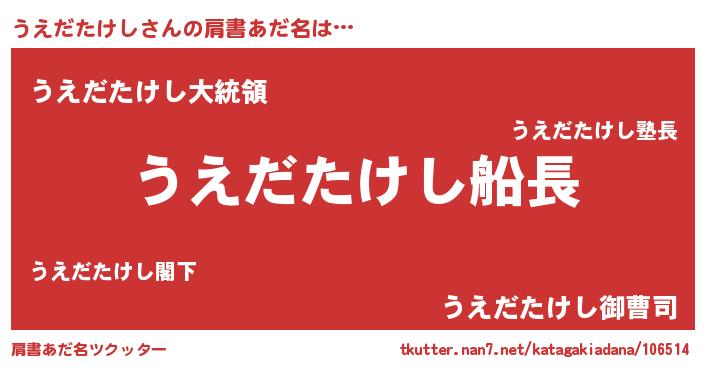 | 男性向けラノベタイトル風あだ名 | 『うちのうえだたけしが世界を掌握している!』 |