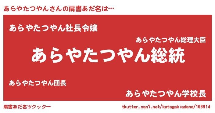 | 男性向けラノベタイトル風あだ名 | 『Re:あらやたつやんから始める異世界生活』 |