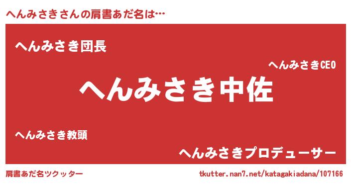 | 胡散臭い通販商品みたいなあだ名 | 『信頼と実績のサプリメント…その名も「へんみさき」』 |