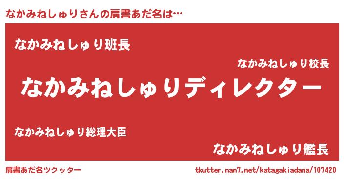 | 男性向けラノベタイトル風あだ名 | 『なかみねしゅりに滅ぼされるだけの簡単なお仕事です』 |