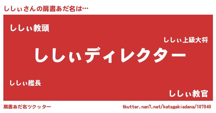 | 男性向けラノベタイトル風あだ名 | 『ししぃに滅ぼされるだけの簡単なお仕事です』 |