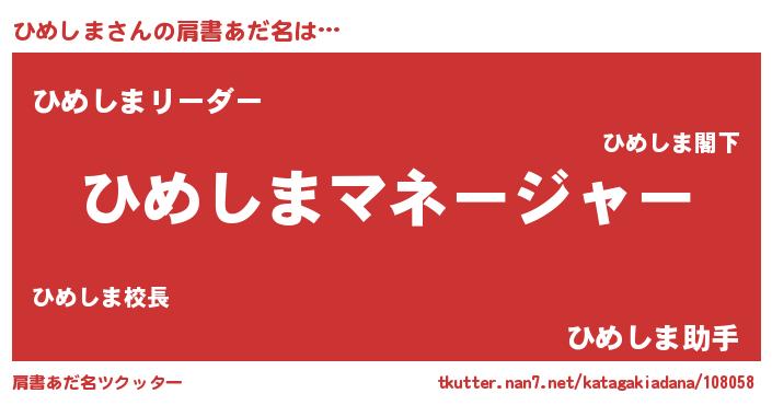 | 胡散臭い通販商品みたいなあだ名 | 『信頼と実績のサプリメント…その名も「ひめしま」』 |