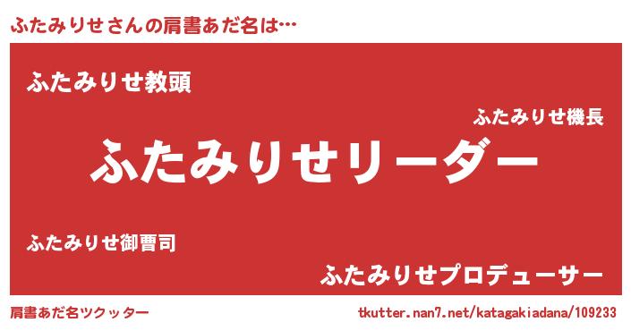 | 男性向けラノベタイトル風あだ名 | 『ふたみりせの嫁は女の子じゃないと思った?』 |