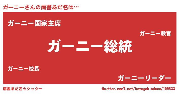 | 男性向けラノベタイトル風あだ名 | 『Re:ガーニーから始める異世界生活』 |