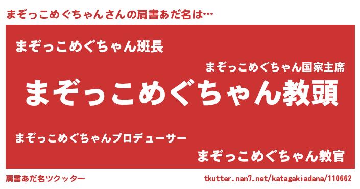 | 男性向けラノベタイトル風あだ名 | 『まぞっこめぐちゃんという概念が存在しない退屈な世界 』 |