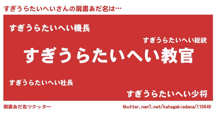 | 意味不明あだ名 | 『住所不定無職すぎうらたいへい(81歳)』 |