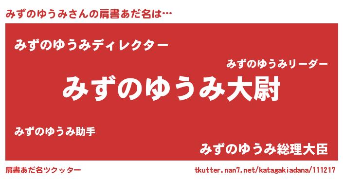 | 男性向けラノベタイトル風あだ名 | 『みずのゆうみ~年齢イコール彼女いない歴の魔法使い~』 |