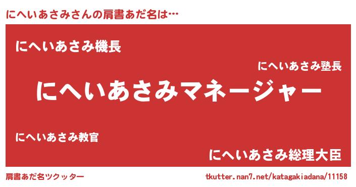 | 男性向けラノベタイトル風あだ名 | 『にへいあさみに滅ぼされるだけの簡単なお仕事です』 |