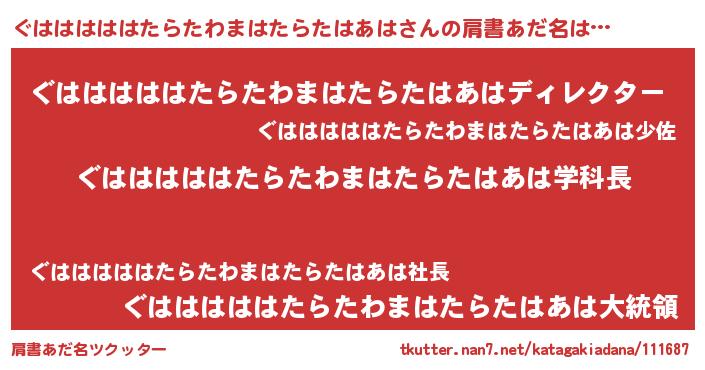 | 男性向けラノベタイトル風あだ名 | 『ノーゲーム・ノーグハハハハハタラタワマハタラタハアハ』 |