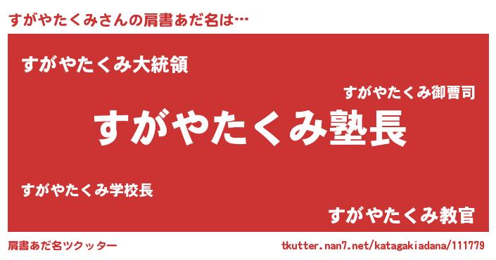 | 意味不明あだ名 | 『とにかく怪しいすがやたくみ』 |