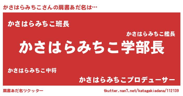 | 男性向けラノベタイトル風あだ名 | 『おまえをオタクにしてやるから、俺をかさはらみちこにしてくれ! 』 |