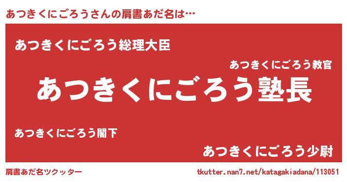 | 男性向けラノベタイトル風あだ名 | 『ダンジョンにあつきくにごろうを求めるのは間違っているだろうか』 |