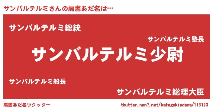 | 男性向けラノベタイトル風あだ名 | 『サンバルテルミ~年齢イコール彼女いない歴の魔法使い~』 |