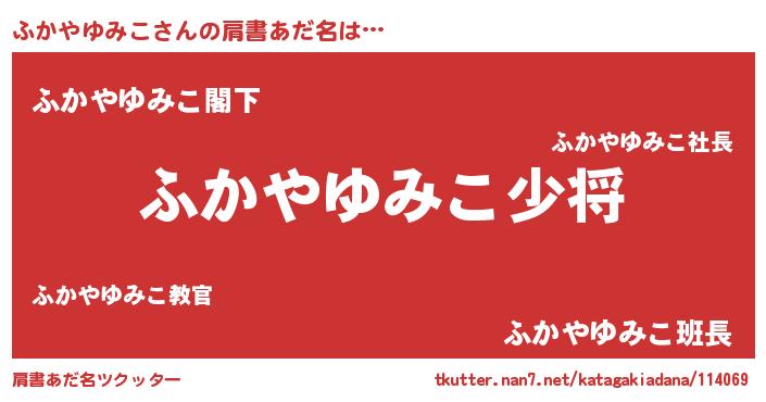 | 男性向けラノベタイトル風あだ名 | 『ふかやゆみこ~年齢イコール彼女いない歴の魔法使い~』 |