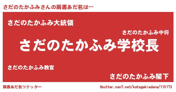 | 男性向けラノベタイトル風あだ名 | 『おまえをオタクにしてやるから、俺をさだのたかふみにしてくれ! 』 |