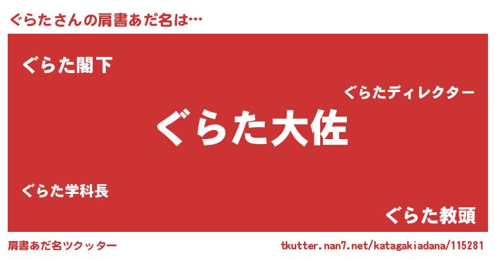 | 男性向けラノベタイトル風あだ名 | 『ぐらた~年齢イコール彼女いない歴の魔法使い~』 |
