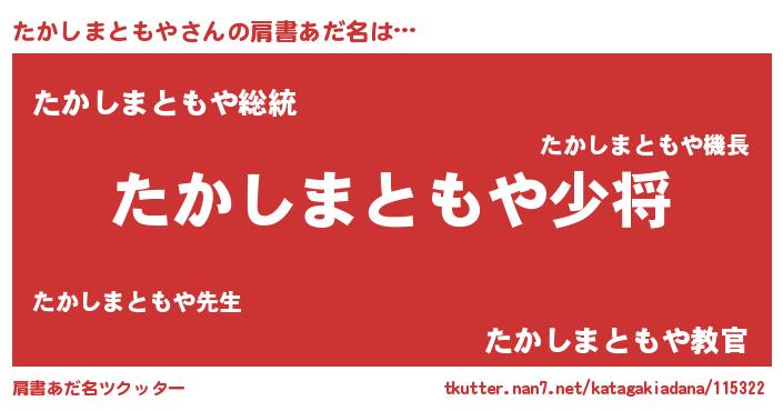 | 男性向けラノベタイトル風あだ名 | 『転生したらたかしまともやだった件』 |