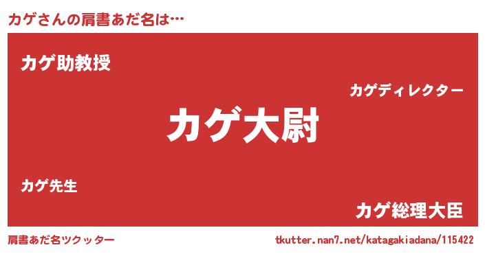 | 男性向けラノベタイトル風あだ名 | 『カゲ~年齢イコール彼女いない歴の魔法使い~』 |