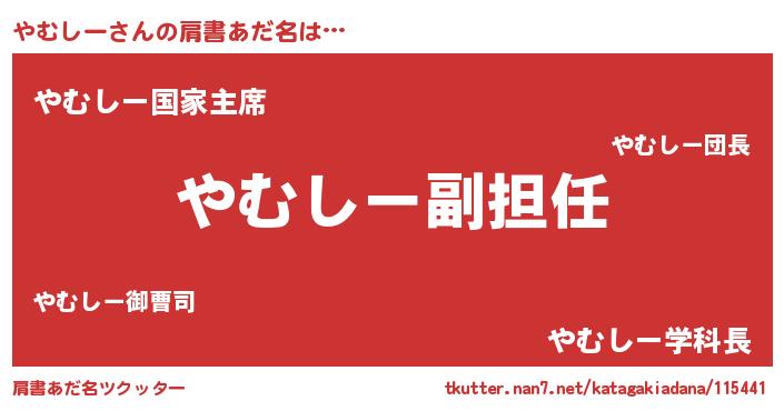 | 男性向けラノベタイトル風あだ名 | 『やむしーという概念が存在しない退屈な世界 』 |