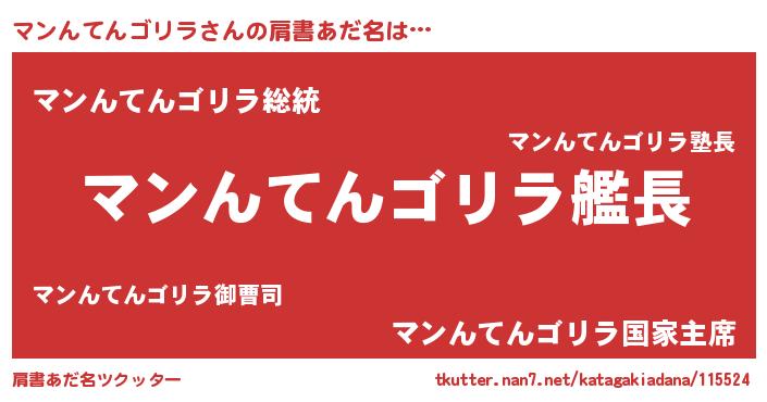 | 男性向けラノベタイトル風あだ名 | 『うちのマンんてんゴリラが世界を掌握している!』 |
